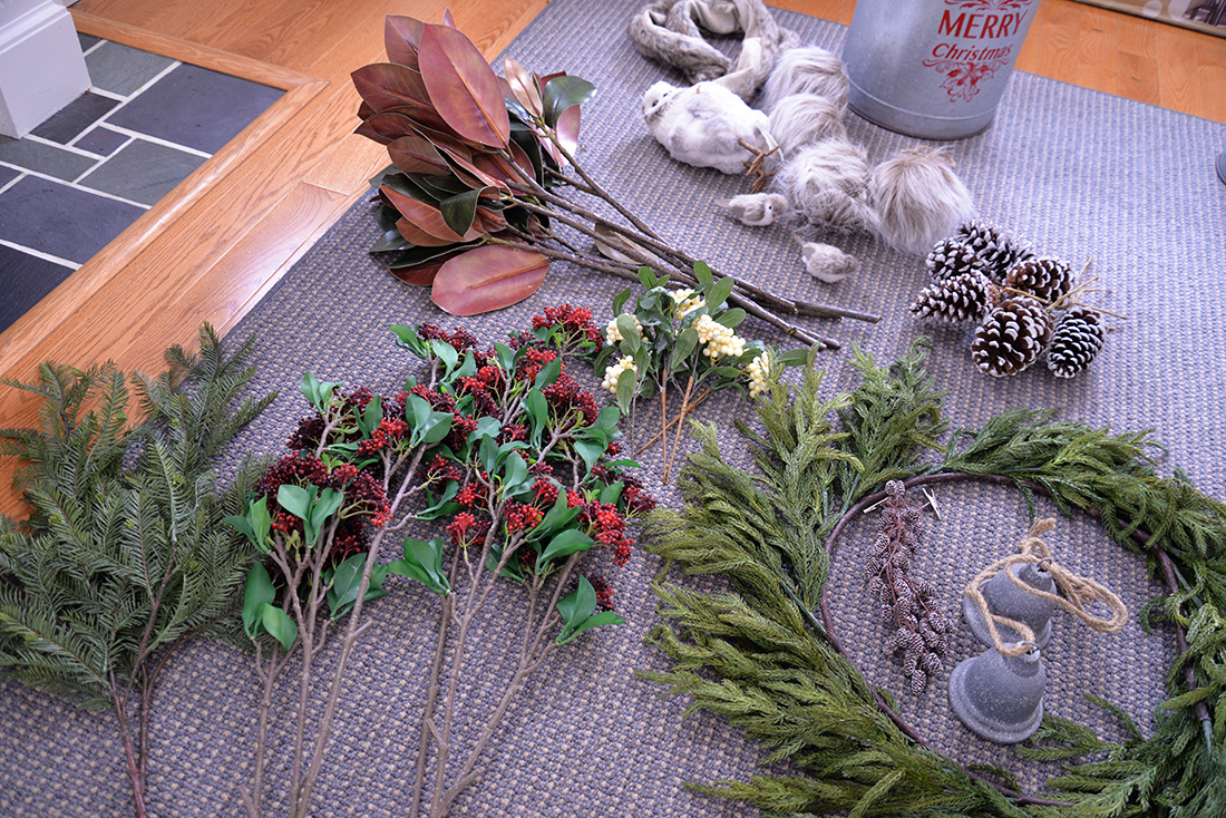 First step is to gather all of the garlands and accessories you'll be using to decorate your mantel. Group like items together. You'll want to think about the order in which you'll attach the items to the garland to ensure you don't miss a step or have to redo things.