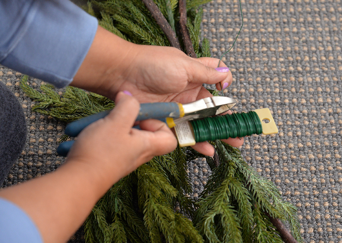 If you are using weaving different types of garlands together one on top of the other, or different materials (like the plaid scarf and magnolia garland I used in this mantel shown above), now is the time to combine them and hold them together with floral wire as well.